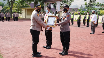 SIMALUNGUN - Kapolres Simalungun AKBP Agus Waluyo, S.I.K., berikan penghargaan kepada personel yang berprestasi dilingkungan Polres Simalungun guna mendukung SDM Polri yang Unggul di Era Police 4.0, dilapangan Apel Polres Simalungun Jln.Jhon Horailam Pematang Raya Kabupaten Simalungun.(01/03/2021)